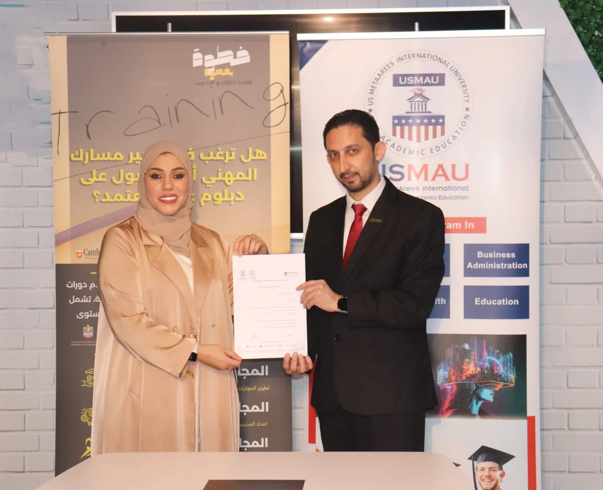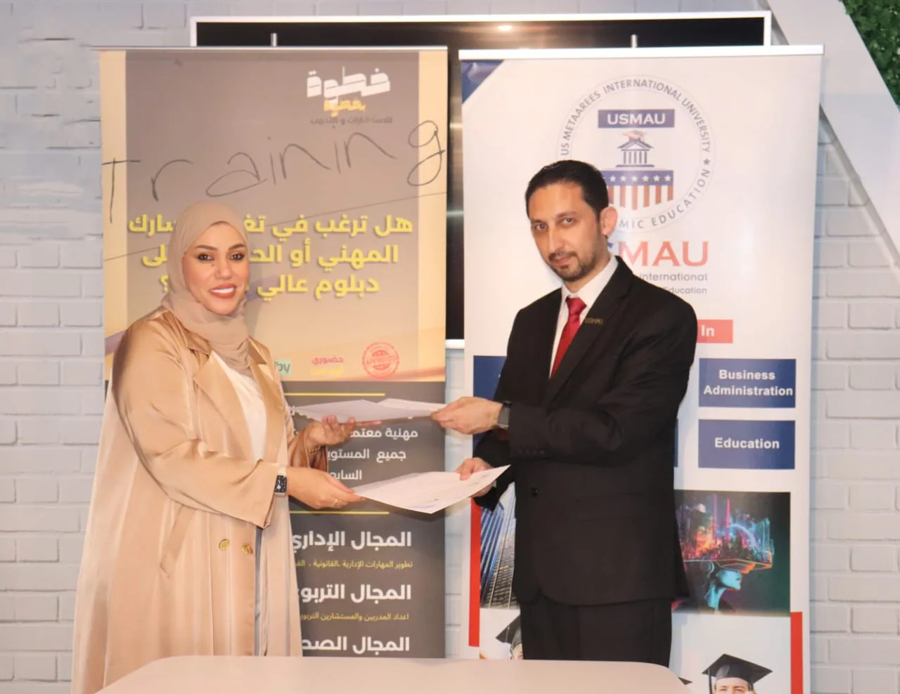 The strategic partnership agreement includes the accreditation of Khatwa Bkhatwa Management Consultancy by the American Academic Board affiliated with US Meta Arees International University in the field of training and professional programs across all specialties. Under this agreement, Khatwa Bkhatwa Management Consultancy becomes authorized to grant American training certificates as well as advanced professional American degrees up to the level of Professional Doctorate.