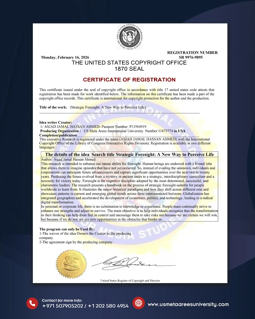 US Meta Arees International University, based in Washington, D.C., has successfully secured copyright and intellectual property protection for the professional master’s thesis of researcher Asjad Jamal Hassan Ahmed through the International Copyright Office of the U.S. Library of Congress – Interactive Rights Division.